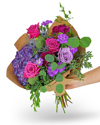 The rich tones of this arrangement will add a pop to any space. Mod Magenta contains hydrangea, roses, carnations, and premium foliage including Silver Dollar Eucalyptus.